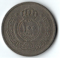 الوجه: المركز كتب 100 فلس أعلاه التاج الملكي وفي الهامش كتب المملكة الأردنية الهاشمية.