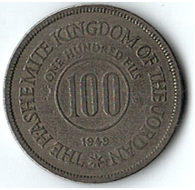 Reverse: The center bears 100, with “100 fils” in English above it, and the date of issue (1949) below it. The margin bears “Hashemite Kingdom of Jordan” in English.